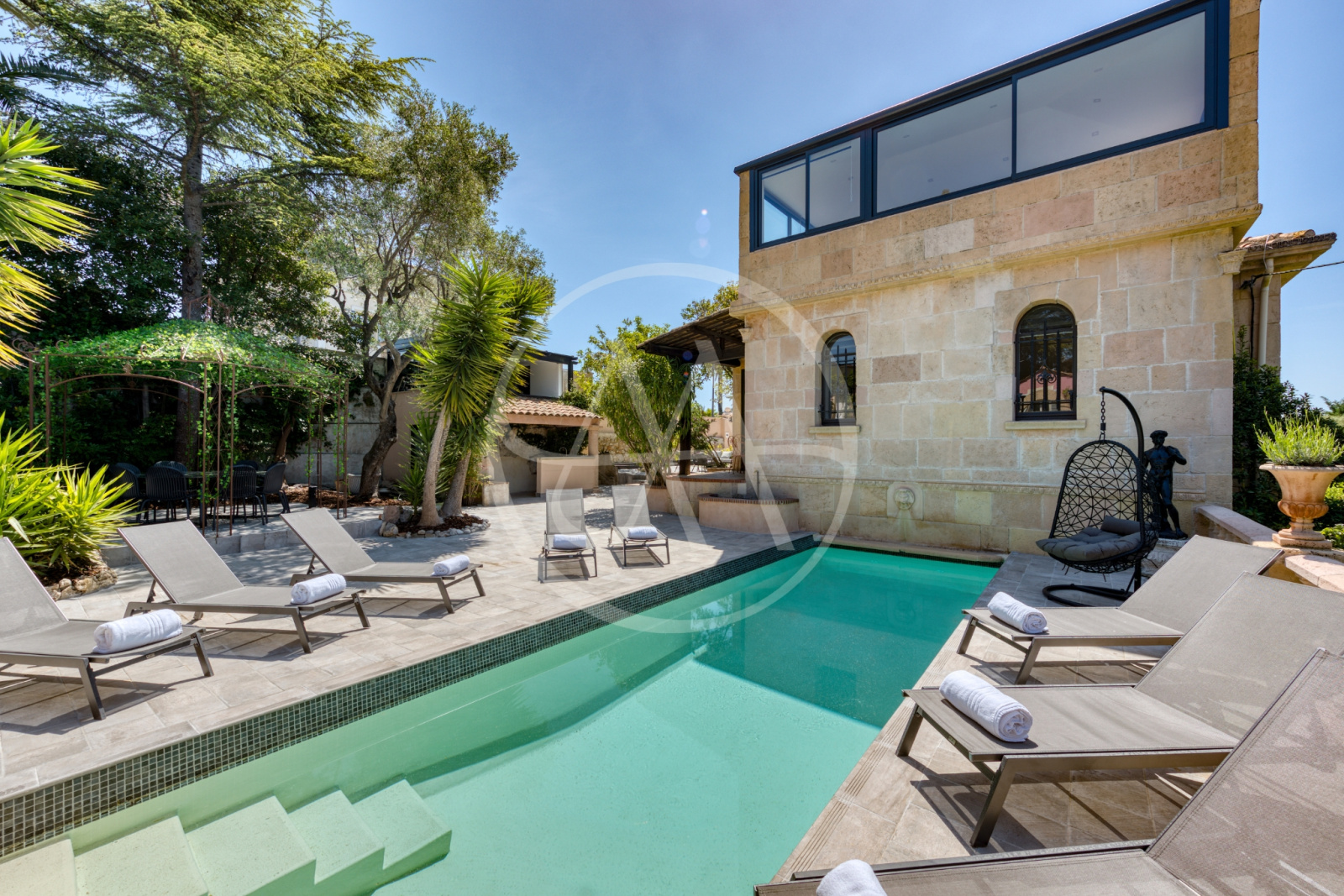 Côté bien-être justement, la villa dispose d’un espace dédié avec hammam, sauna et équipements sportifs. La piscine, pouvant être chauffée sur demande, s’intègre parfaitement à l’atmosphère de sérénité qui règne dans les lieux. Pour un confort absolu, un studio indépendant avec accès direct à la piscine vient compléter la propriété, idéal pour loger un invité, un adolescent ou du personnel dans une configuration discrète et autonome.